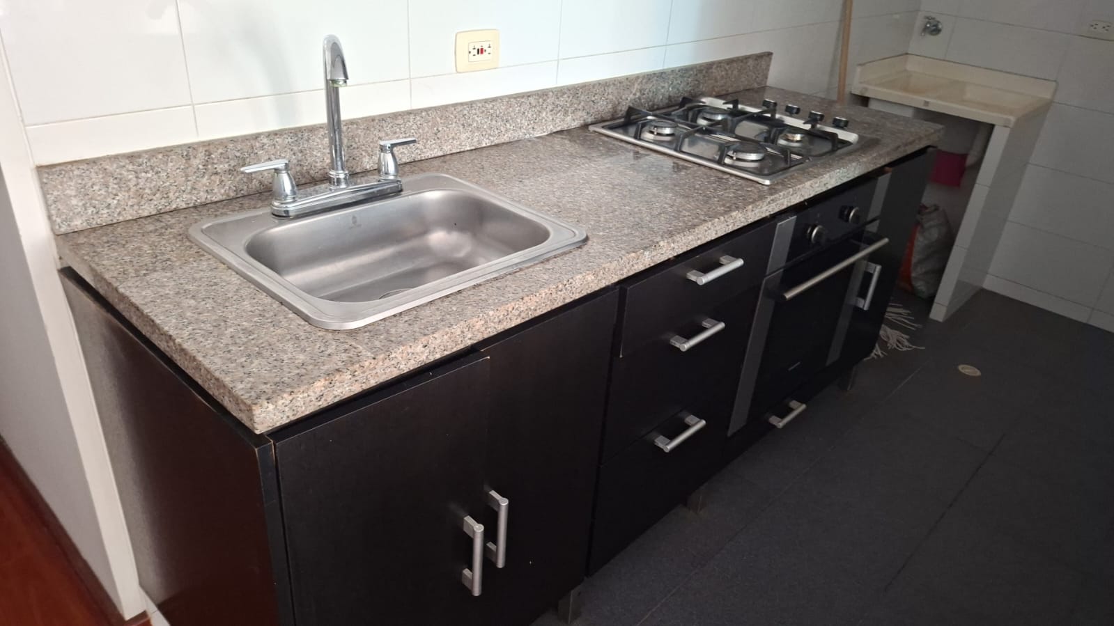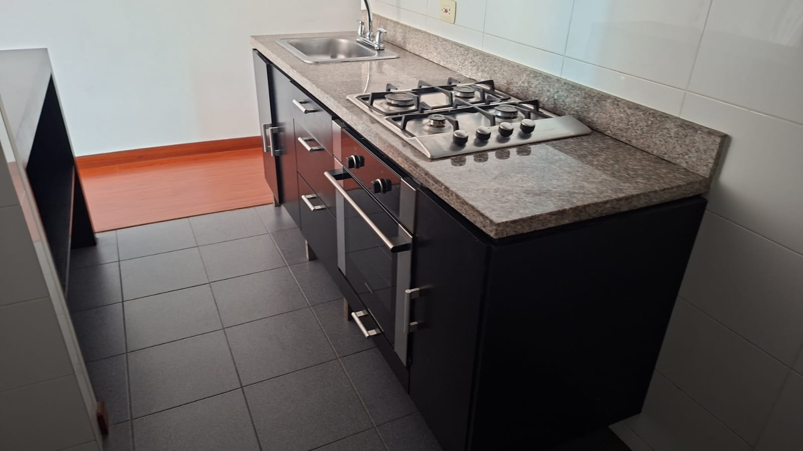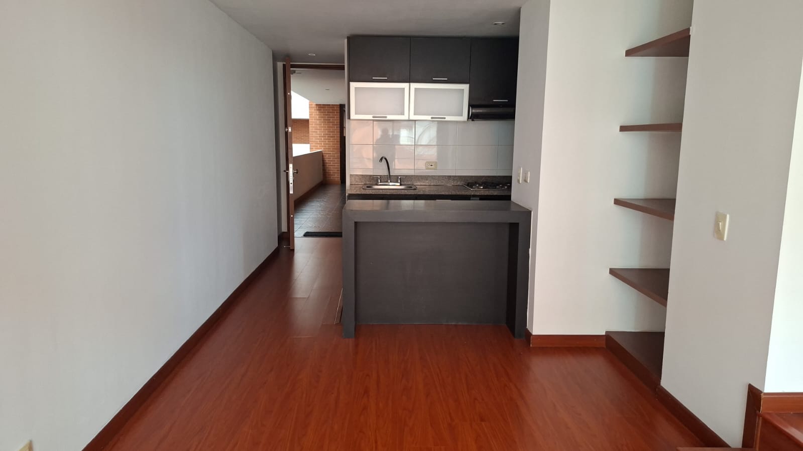Apartamento exterior, sala comedor con balcón, cocina integral abierta, zona de ropas, una alcoba con baño privado y vista a la sala, baño social, un garaje y deposito.